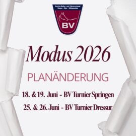 Liebe Reiterinnen und Reiter, für die Turniersaison 2026 gibt es eine Änderung im geplanten Modus. Da am ursprünglichen Termin des BV-Springturniers zeitgleich ein weiteres Turnier stattfindet, haben wir uns entschieden, die Termine zu... Weiterlesen