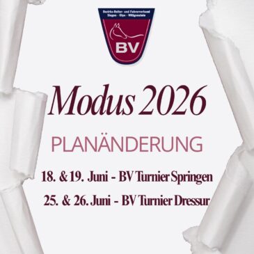 Liebe Reiterinnen und Reiter, für die Turniersaison 2026 gibt es eine Änderung im geplanten Modus. Da am ursprünglichen Termin des BV-Springturniers zeitgleich ein weiteres Turnier stattfindet, haben wir uns entschieden, die Termine zu tauschen, um Überschneidungen zu vermeiden und allen … Weiterlesen