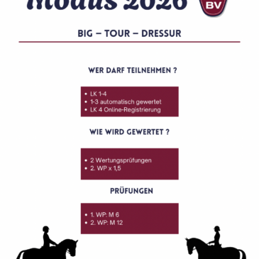Liebe Reiterinnen und Reiter, für die Turniersaison 2026 gibt es eine Änderung im geplanten Modus. Da am ursprünglichen Termin des BV-Springturniers zeitgleich ein weiteres Turnier stattfindet, haben wir uns entschieden, die Termine zu tauschen, um Überschneidungen zu vermeiden und allen … Weiterlesen