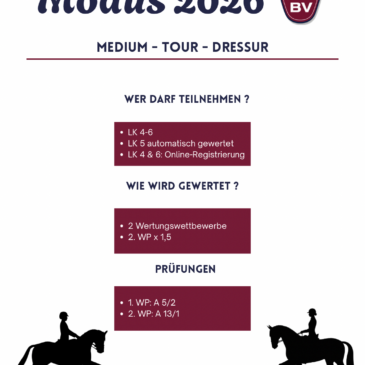In der E-Tour Springen wird im Finale eine Prüfung mit Stechen anstatt Siegerrunde ausgeschrieben. In der L-Tour Dressur hat der Pferdesportverband Westfalen die Dispens für eine L-Dressur auf Kandare widerrufen und dafür eine L**-Dressur auf Trense gestattet. Den aktuellen Modus … Weiterlesen