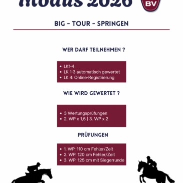 Liebe Reiterinnen und Reiter, für die Turniersaison 2026 gibt es eine Änderung im geplanten Modus. Da am ursprünglichen Termin des BV-Springturniers zeitgleich ein weiteres Turnier stattfindet, haben wir uns entschieden, die Termine zu tauschen, um Überschneidungen zu vermeiden und allen … Weiterlesen